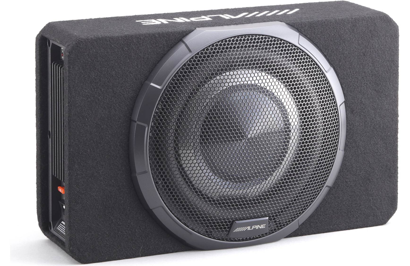 Alpine's PWV-SB10 BassRev powered subwoofer serves up the extreme low-frequency bass sound you want from a sealed enclosure that'll fit almost anywhere, including behind the seat in a pickup. This sturdy double-braced MDF bass box delivers maximum punch from its high-performance 10" woofer and onboard 400-watt amplifier. Carpet protects the enclosure from nicks and scratches, while a metal grille protects the speaker cone from damage.