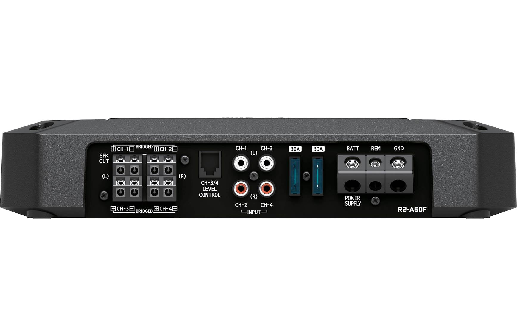 The R2-A60F 4-channel amp produces 100 watts RMS per channel, perfectly matching the power ratings of Alpine's R-Series speakers. You can also use this versatile amp in 3-channel mode, driving a pair of speakers with the front channels, and bridging the rear channels to send up to 300 watts RMS to a subwoofer. Advanced Class D amp technology allows this powerful amp to be built small enough to fit in almost any location.