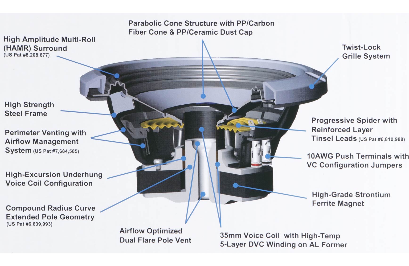- carbon fiber/polypropylene cone with HAMR rubber surround